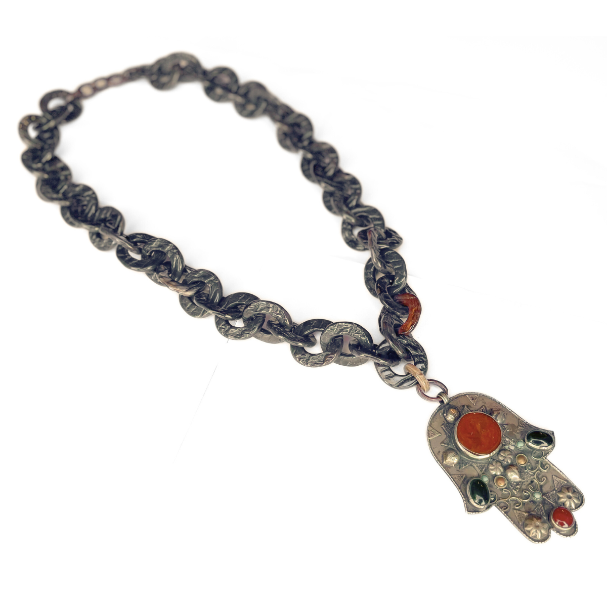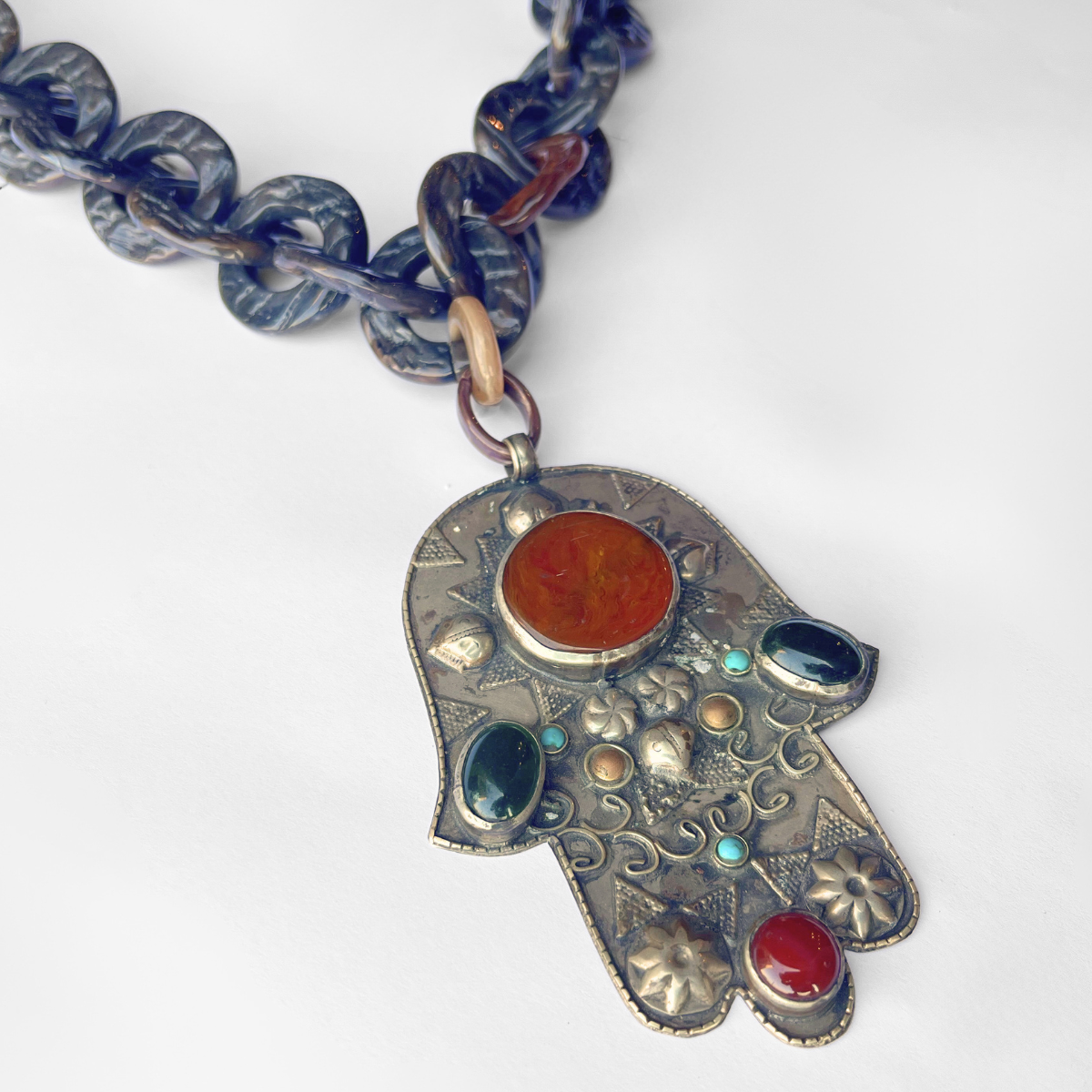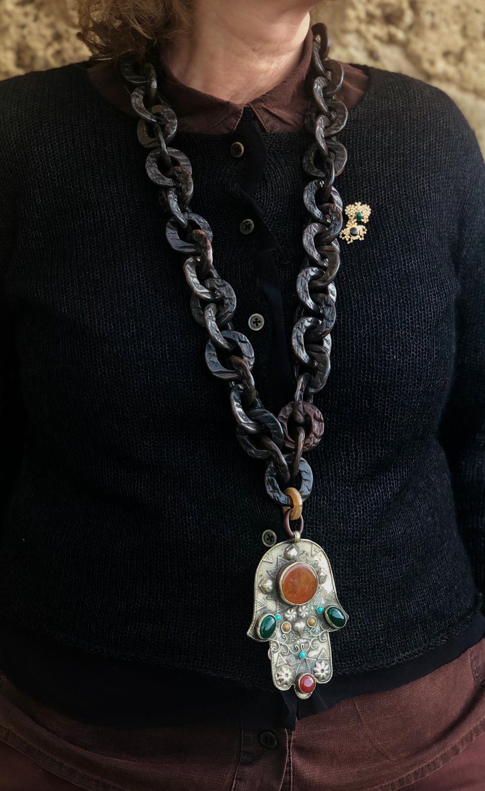 שרשרת ארוכה במיוחד עם תליון חמסה גדול במיוחד - שרשרת זו בהחלט מושכת את העין! תליון חמסה אומנותי זה מיוצר במקור באפגניסטן ומשולב עם שרשראות קרן דמויות שרף.