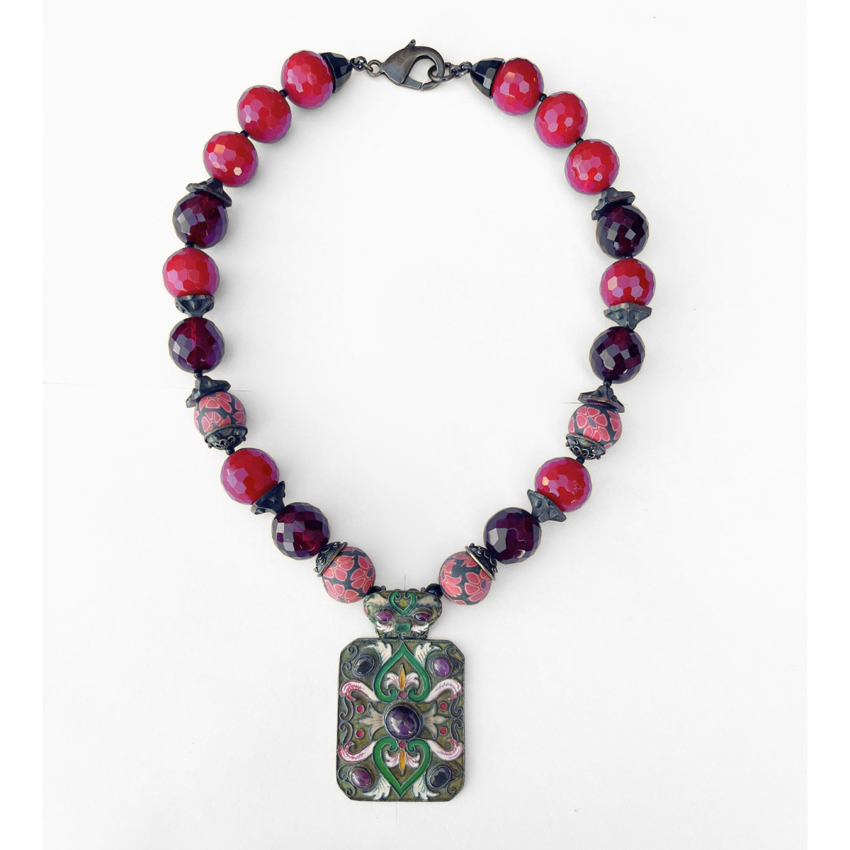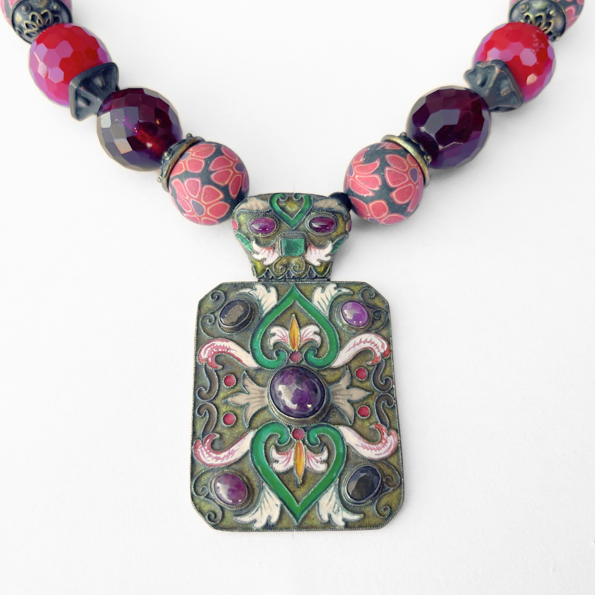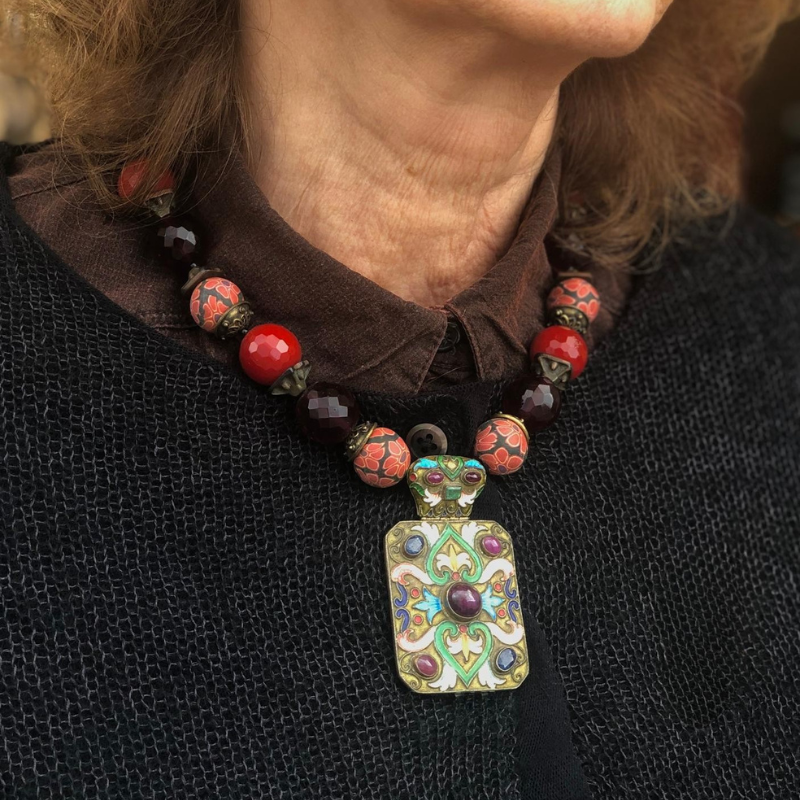 עשוי מחרוזי קריסטל צ'ז בצבעי אדום דובדבן ואדום יין, בשילוב חרוזי פימו והכי חשוב תליון אמייל מהמם עם אבנים חצי יקרות.